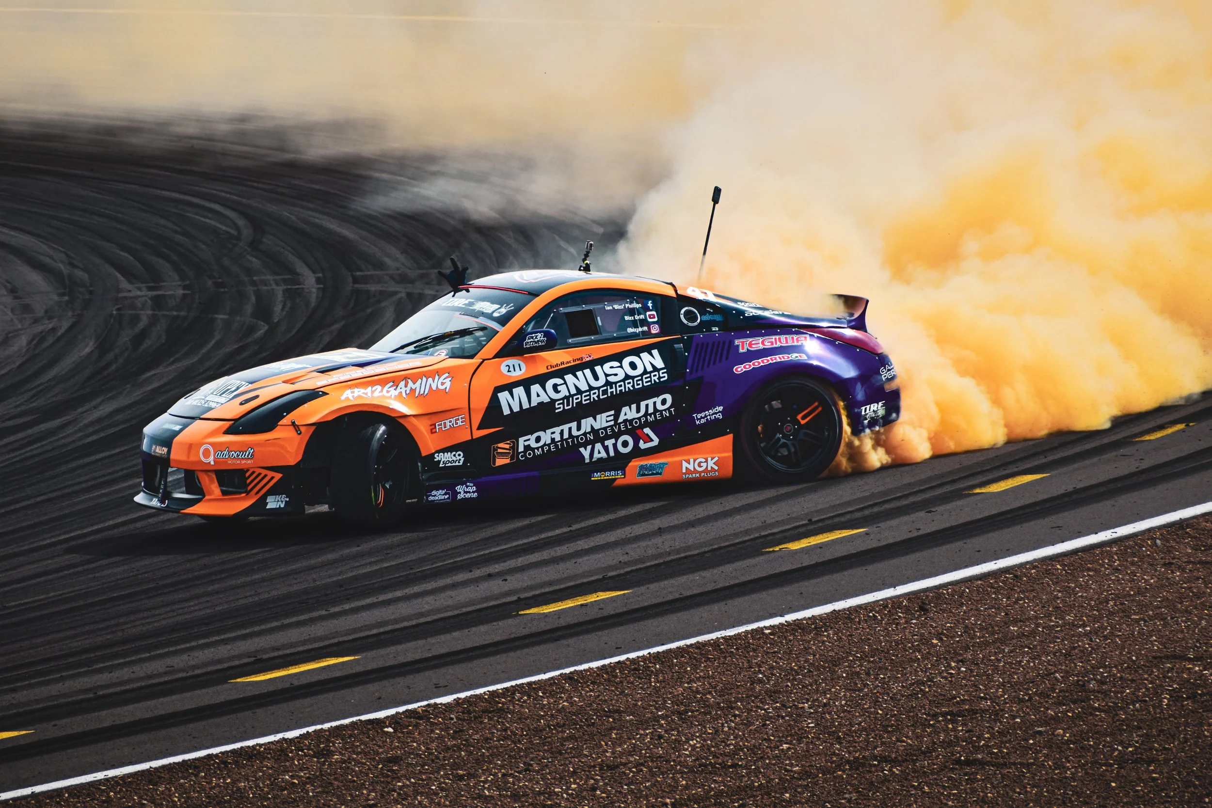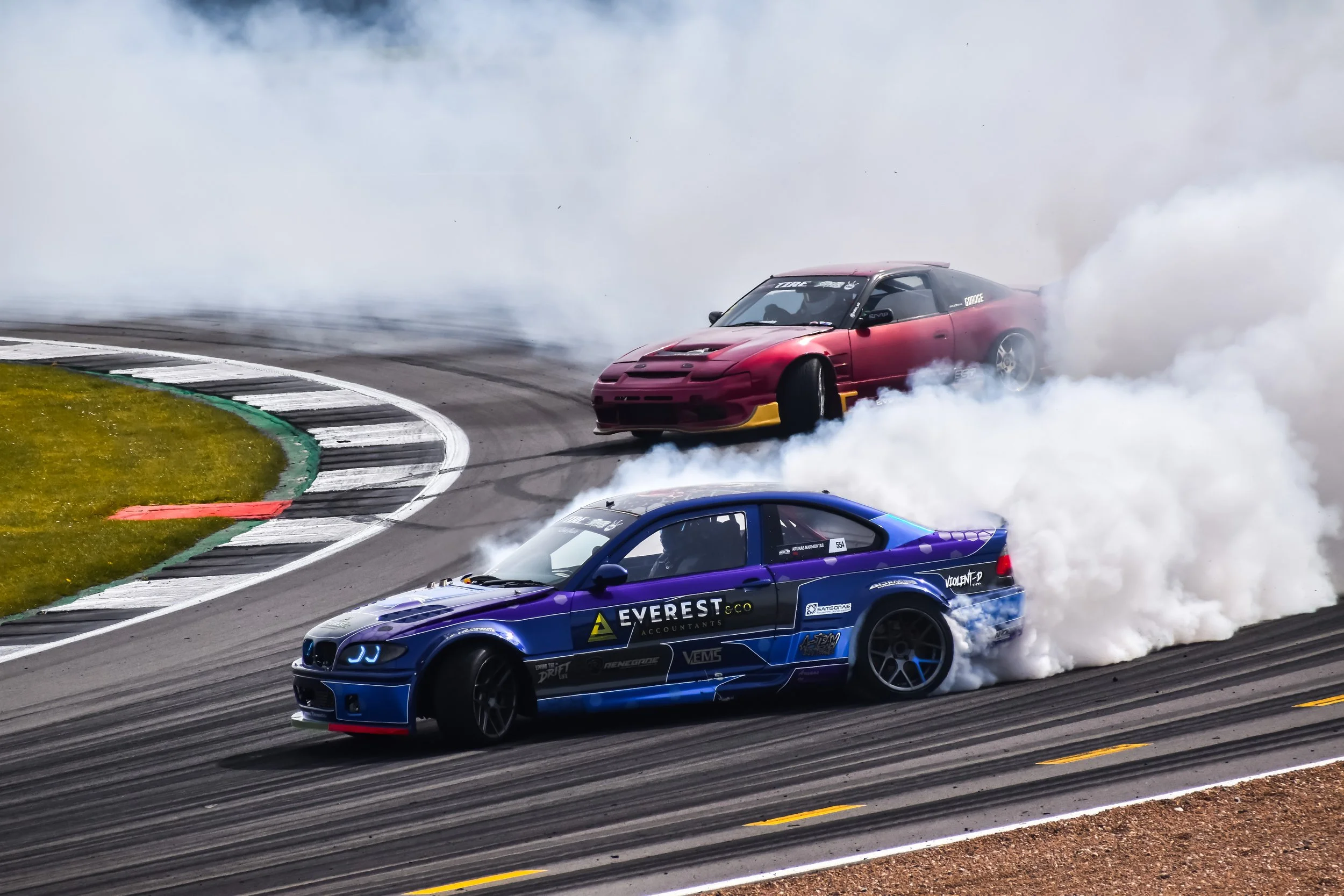 Two racing cars drifting on a race track, generating smoke from their tires with a grassy area and curbs in the background.
