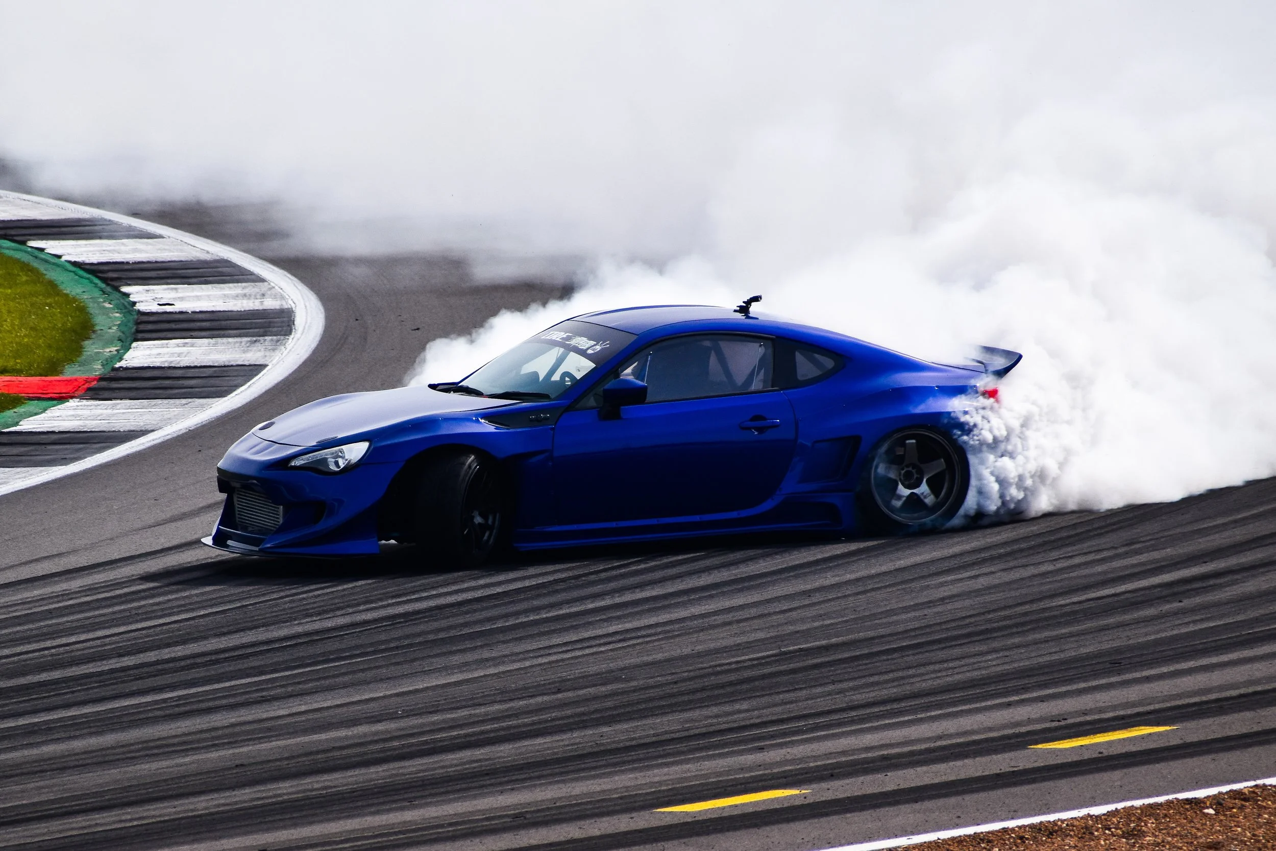 A blue sports car drifting on a race track, kicking up white smoke from its tires.