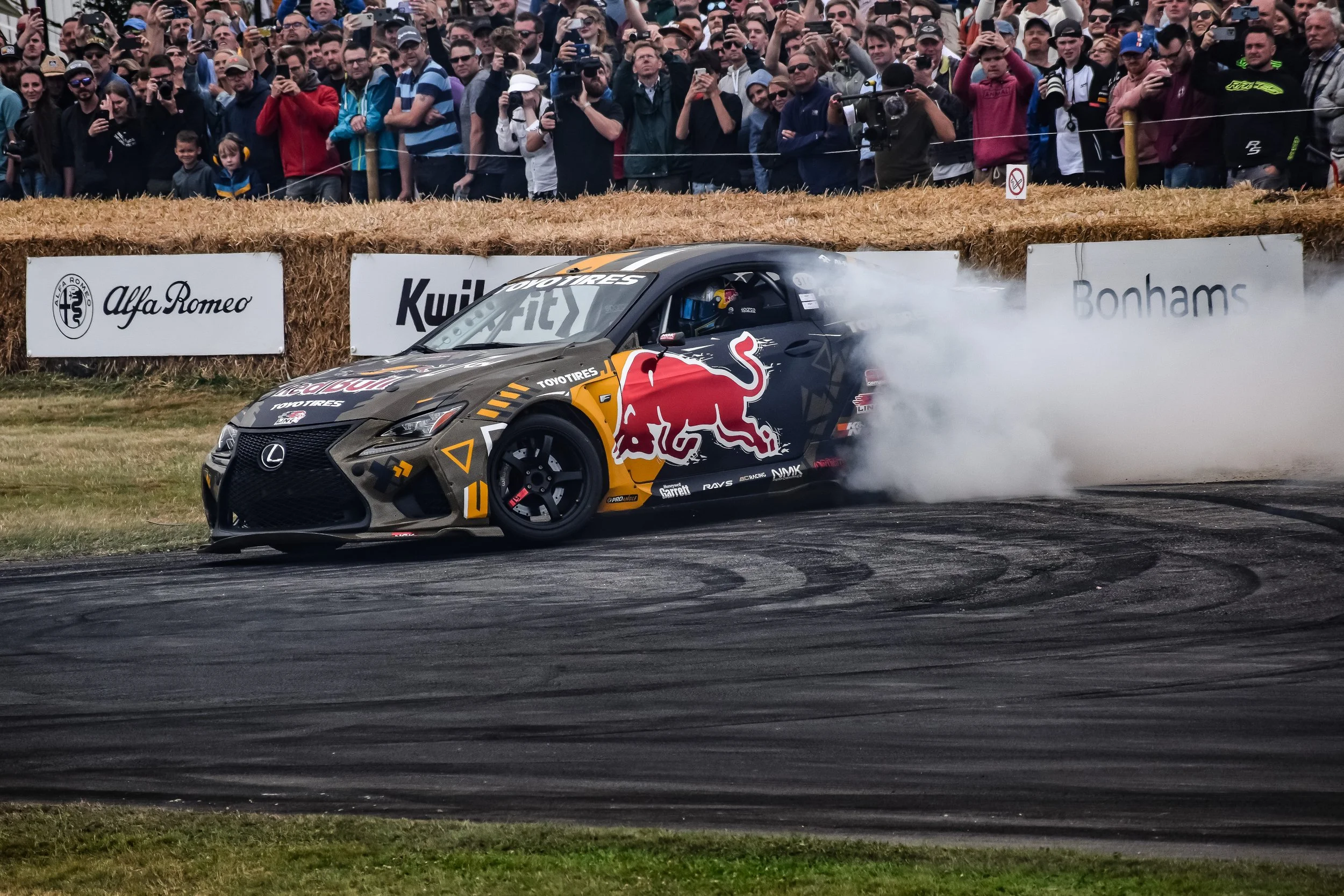 A race car with Red Bull logo spinning on a track, creating tire smoke, with a crowd of spectators watching behind a barrier.