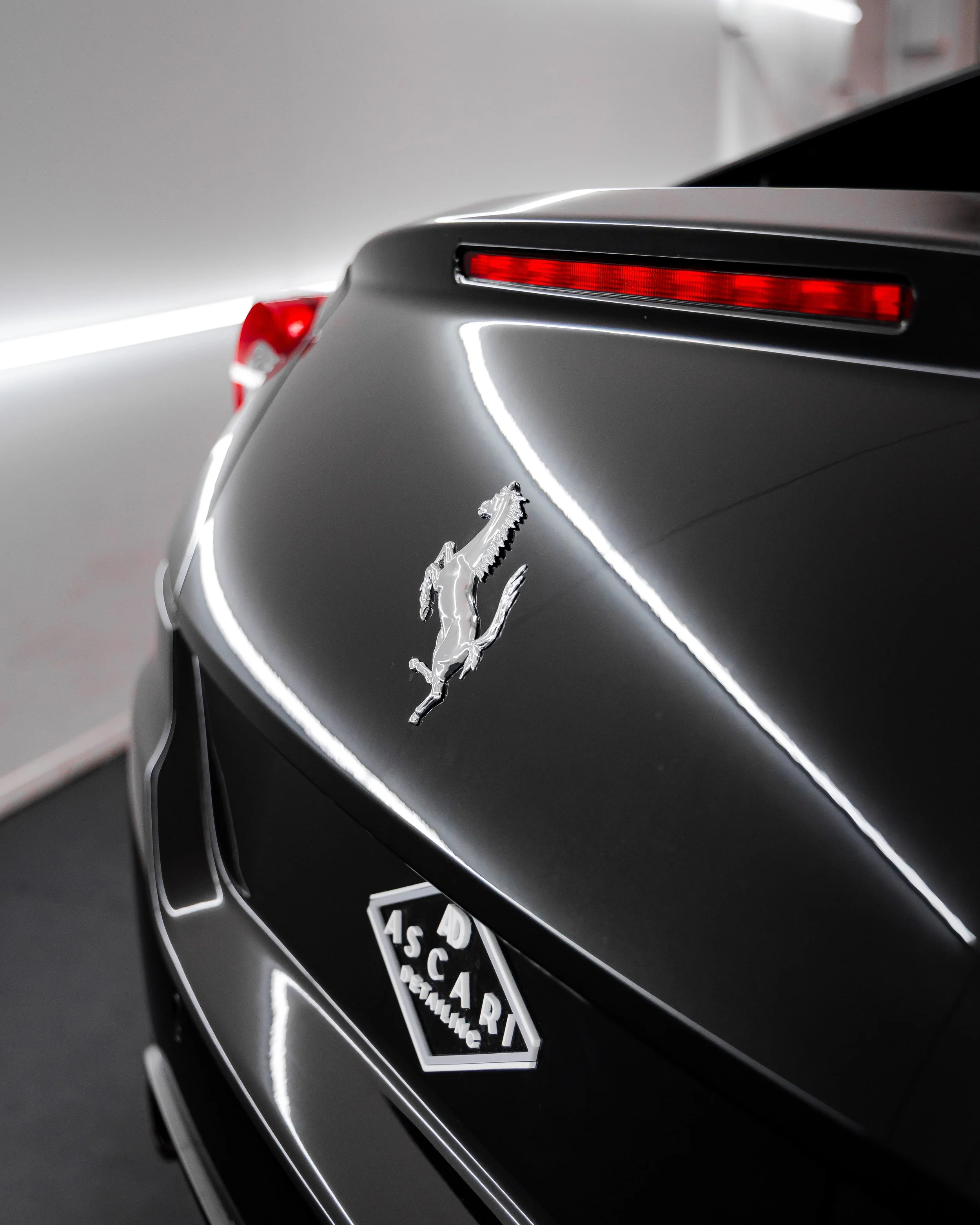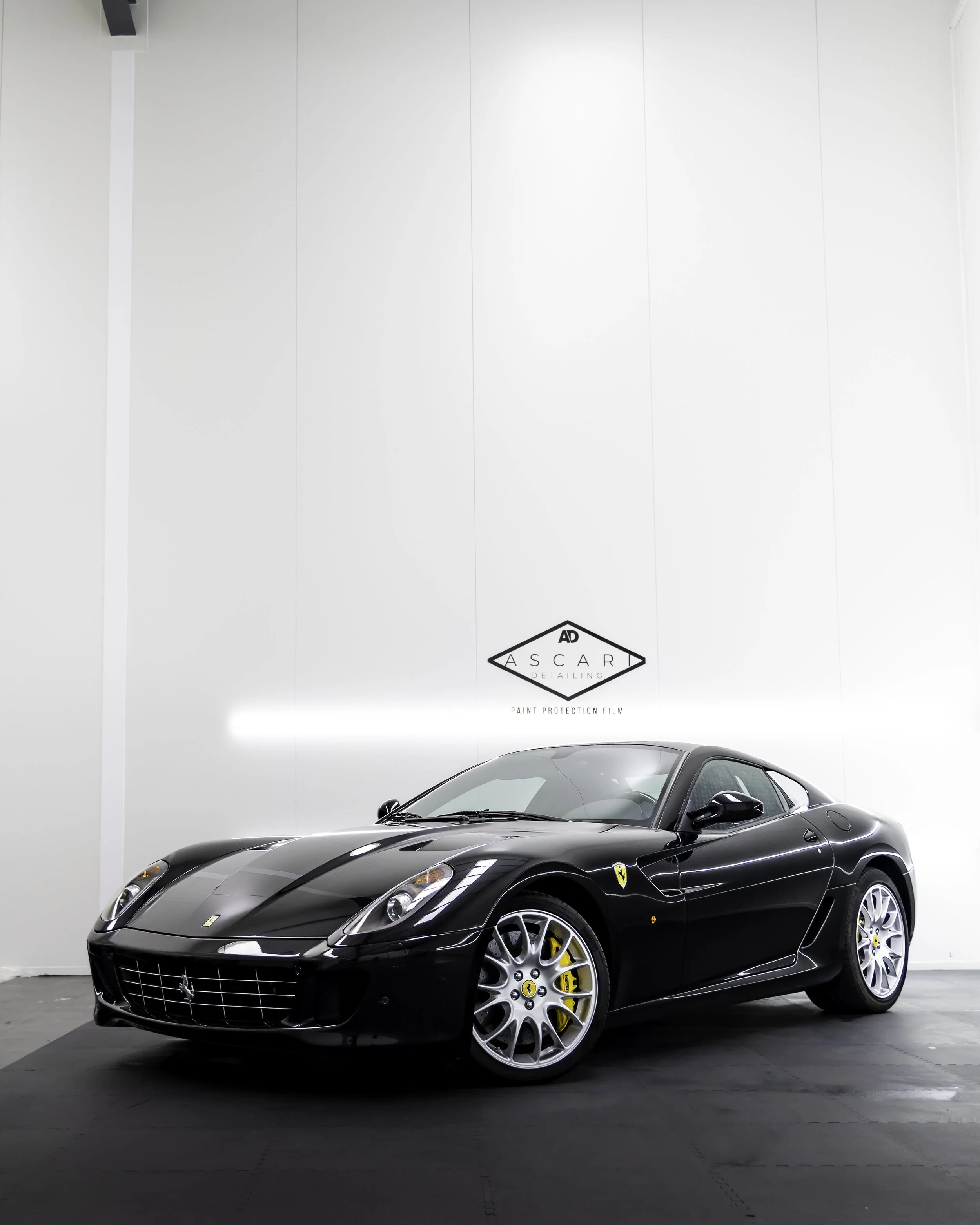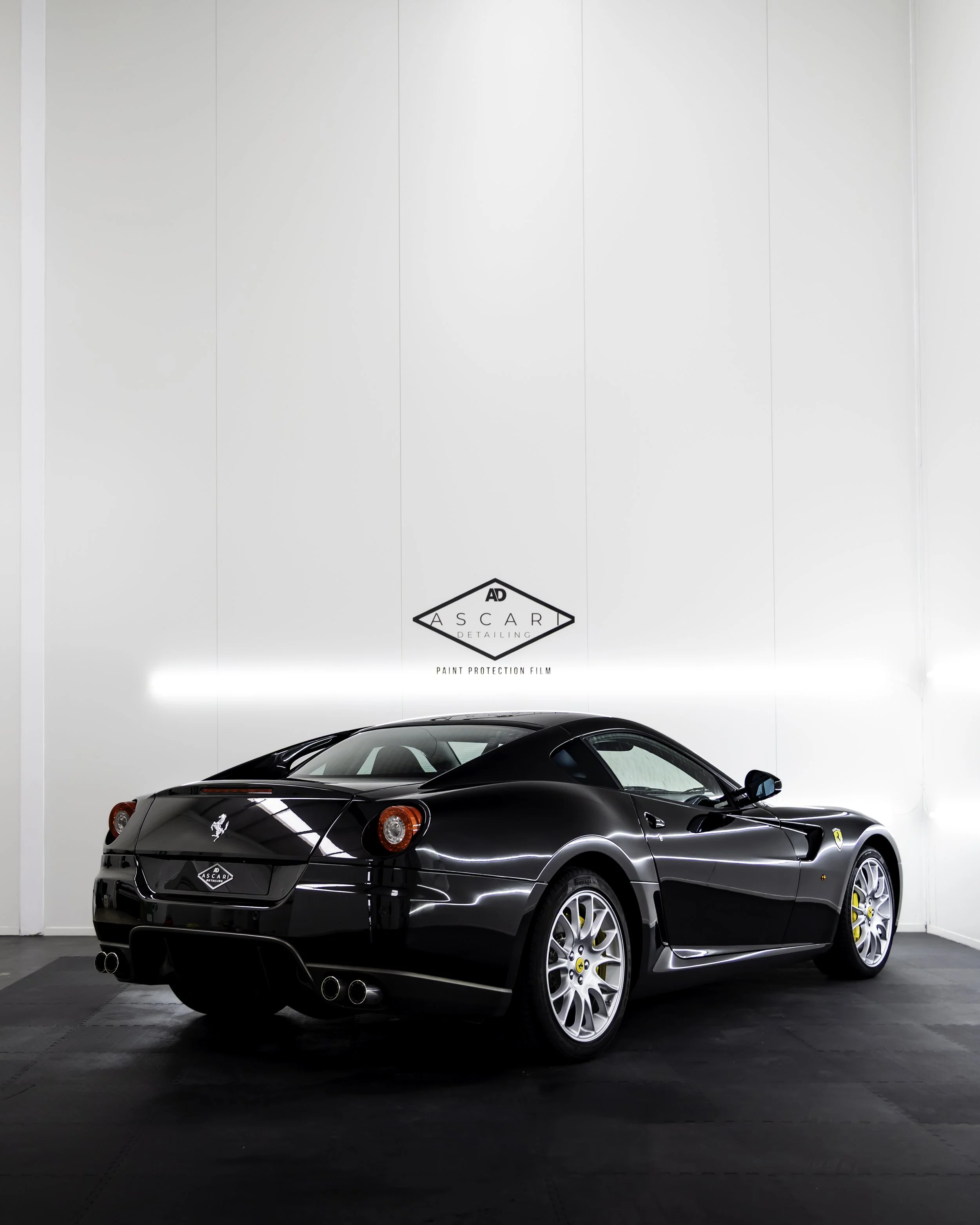 A black Ferrari sports car parked indoors in front of a white wall with a logo that reads 'Ascari Detailing' and 'Paint Protection Film'.