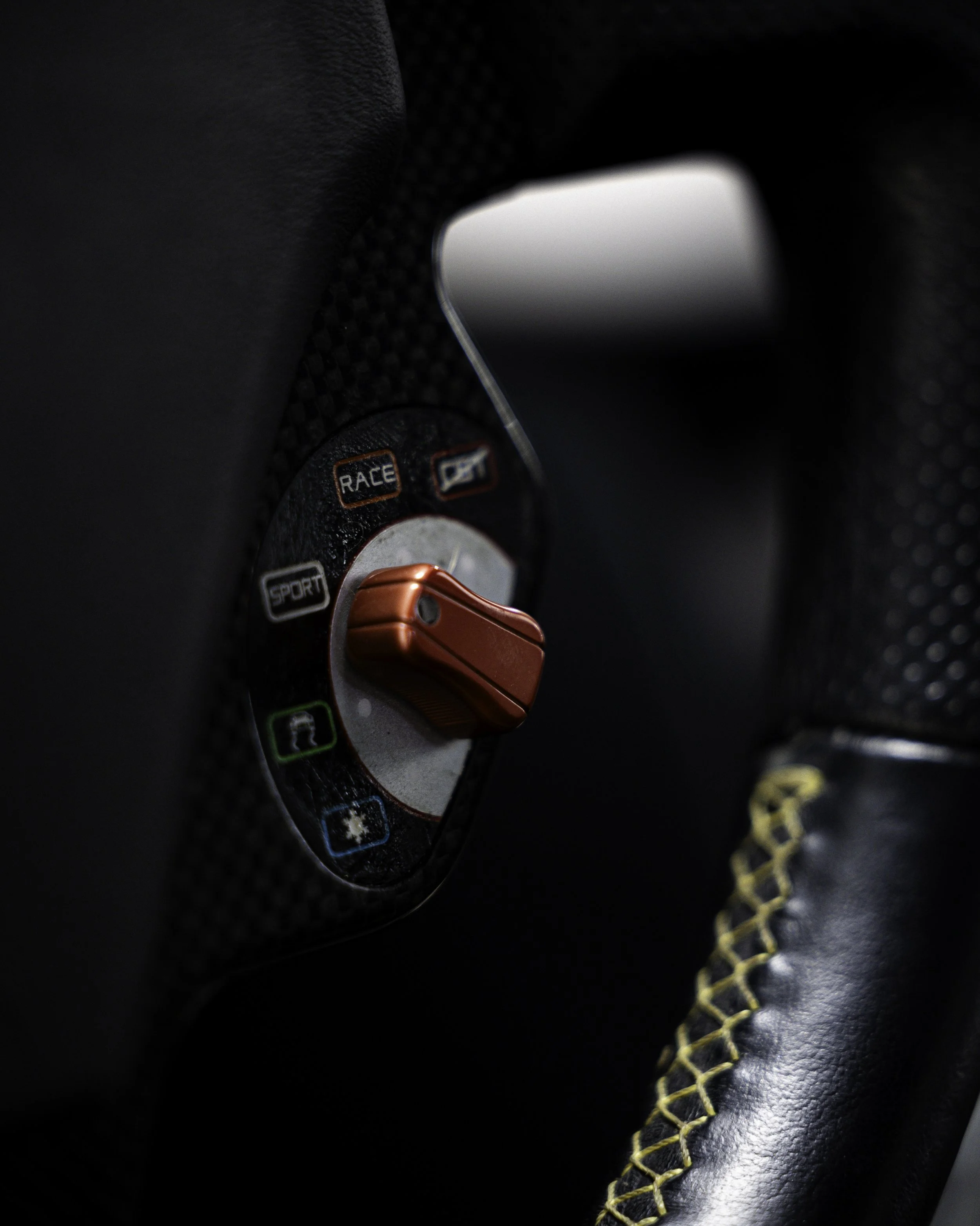 Close-up of a racing car steering wheel with a red control switch and various mode options labeled Race, Drv, Sport, and others.