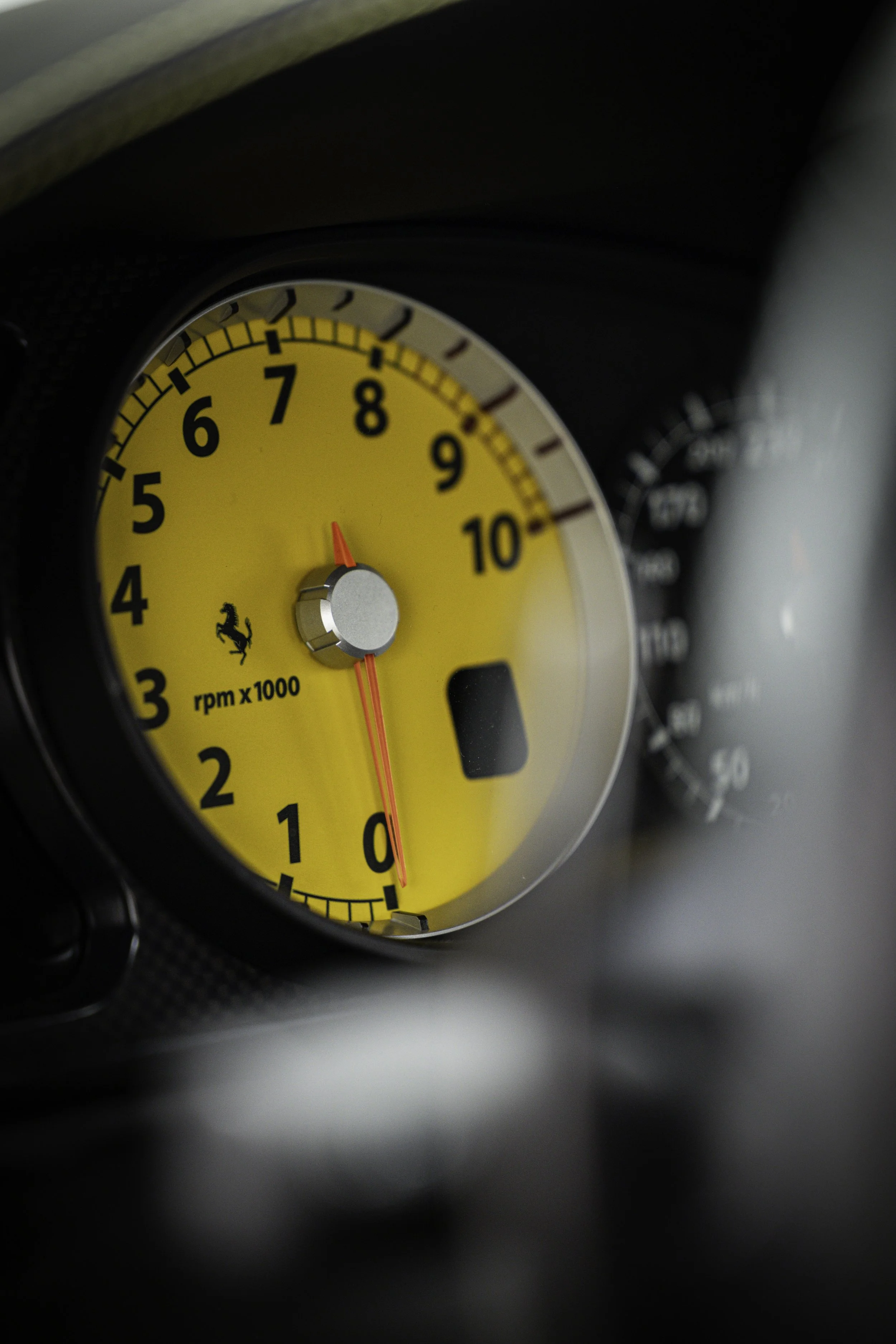 A close-up of a car's yellow tachometer with a red needle pointing at 0 RPM, featuring the Ferrari logo.